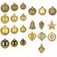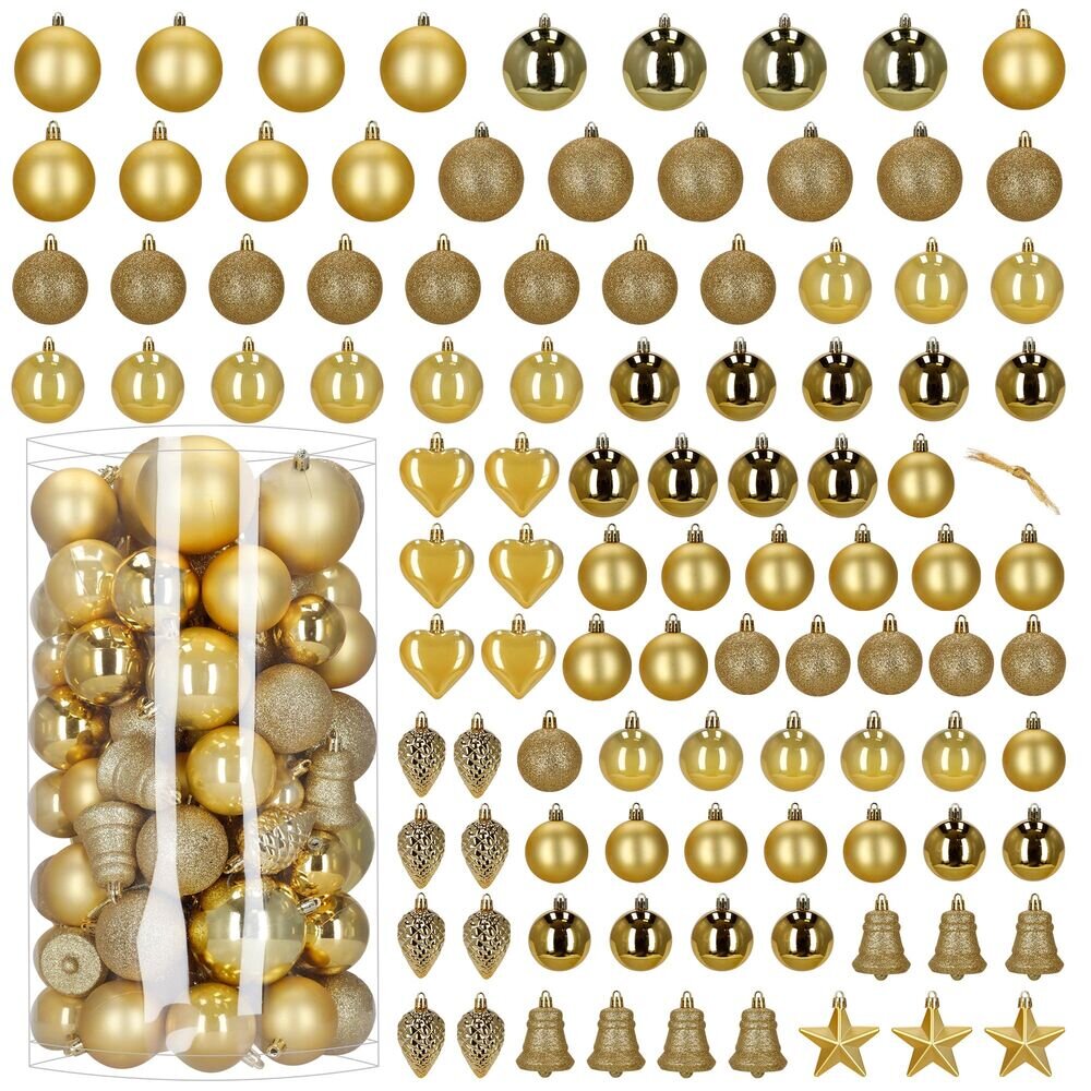 Velká sada zlatých vánočních ozdob v různých velikostech a povrchových úpravách dodá výzdobě luxusní, slavnostní a elegantní vzhled. Obsahuje lehké, nerozbitné plastové koule i tematické dekorace s poutky pro snadné zavěšení. Ideální na stromeček i jako dekorace v interiéru či exteriéru. Průměry...