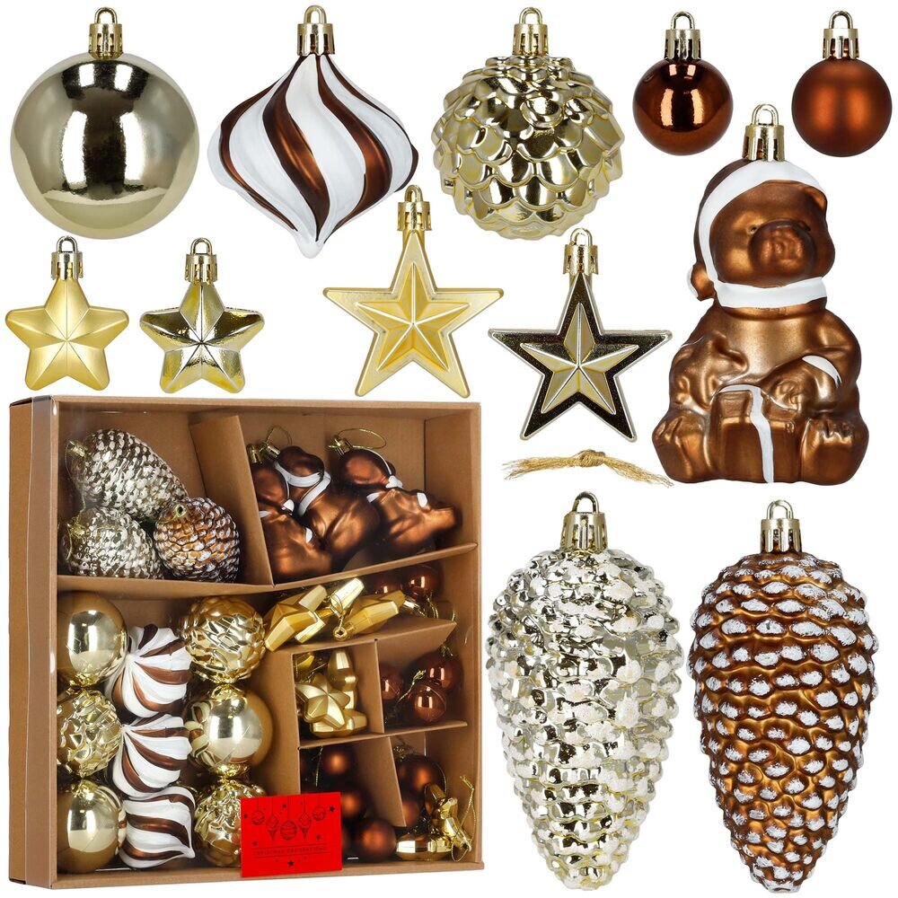 Sada zlato-hnědých vánočních ozdob v pestrém mixu tvarů dodá výzdobě teplý a elegantní vzhled. Obsahuje lehké, nerozbitné plastové koule, hvězdy, figurky i šišky s poutky pro snadné zavěšení. Ideální na stromeček i jako dekorace do interiéru či exteriéru. Průměry ozdob jsou různé.Hlavní...