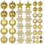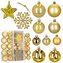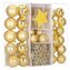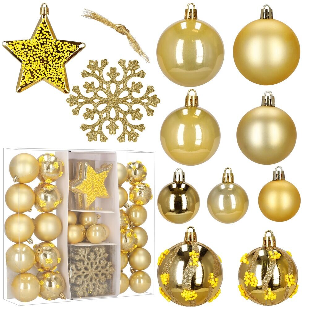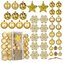 Sada zlatých vánočních ozdob v různých velikostech a provedeních dodá výzdobě luxusní a slavnostní vzhled. Obsahuje lehké, nerozbitné plastové koule, vločky i hvězdy, všechny s poutky pro snadné zavěšení. Vhodné na stromeček i jako dekorace do interiéru či exteriéru. Průměry koulí: 3,5 cm, 4,5 cm...
