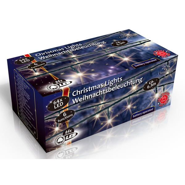 Vánoční vnitřní světelný řetěz 64x LED, 6 režimů, na baterie 3x AA, délka 6.3 m