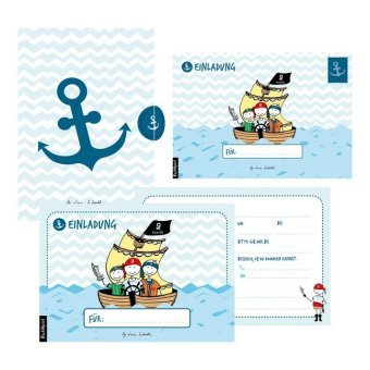 12 hochwertige Einladungskarten im klassischen Postkartenformat DIN A6, die auf Vorder- und Rückseite mit einem süßen Piratenmotiv bedruckt sind. Die Geburtstagseinladungen bestehen aus hochwertigem Karton. Zu jeder Einladungskarte gibt es den passenden Briefumschlag (DIN C6), ebenfalls mit Piratenmotiv. Verpackt ist das Set in einer farblich und thematisch passenden geschlossenen Schachtel.